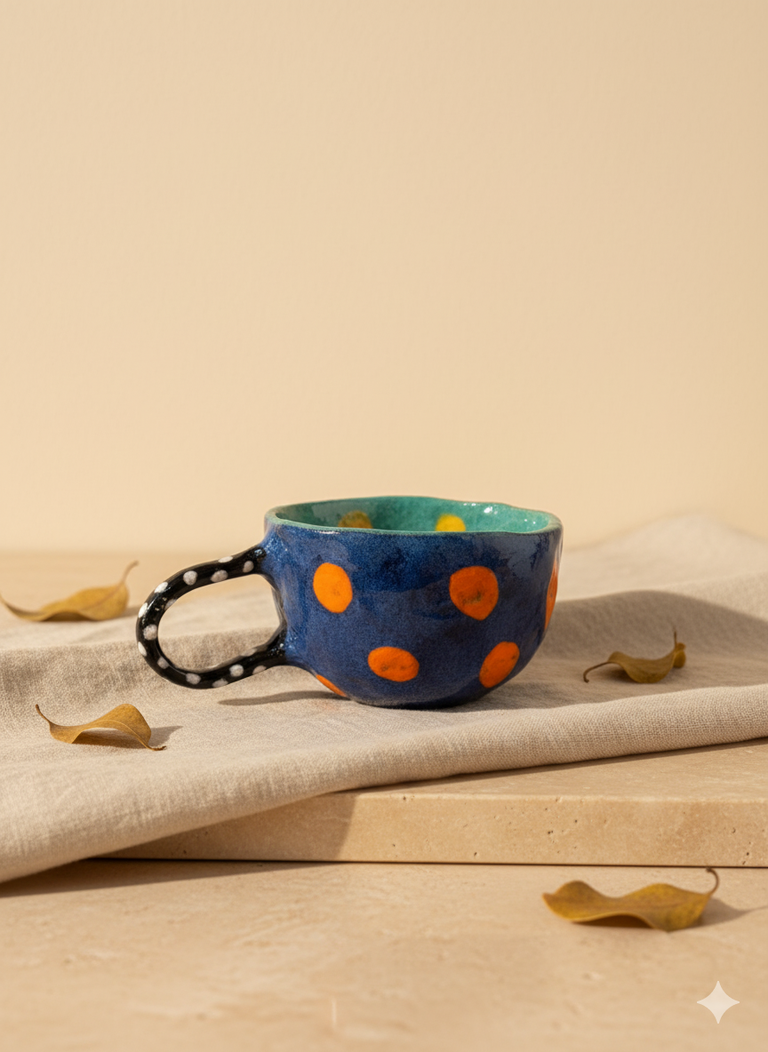El Yapımı Renkli Seramik Kupa – Lacivert & Turuncu Noktalı
